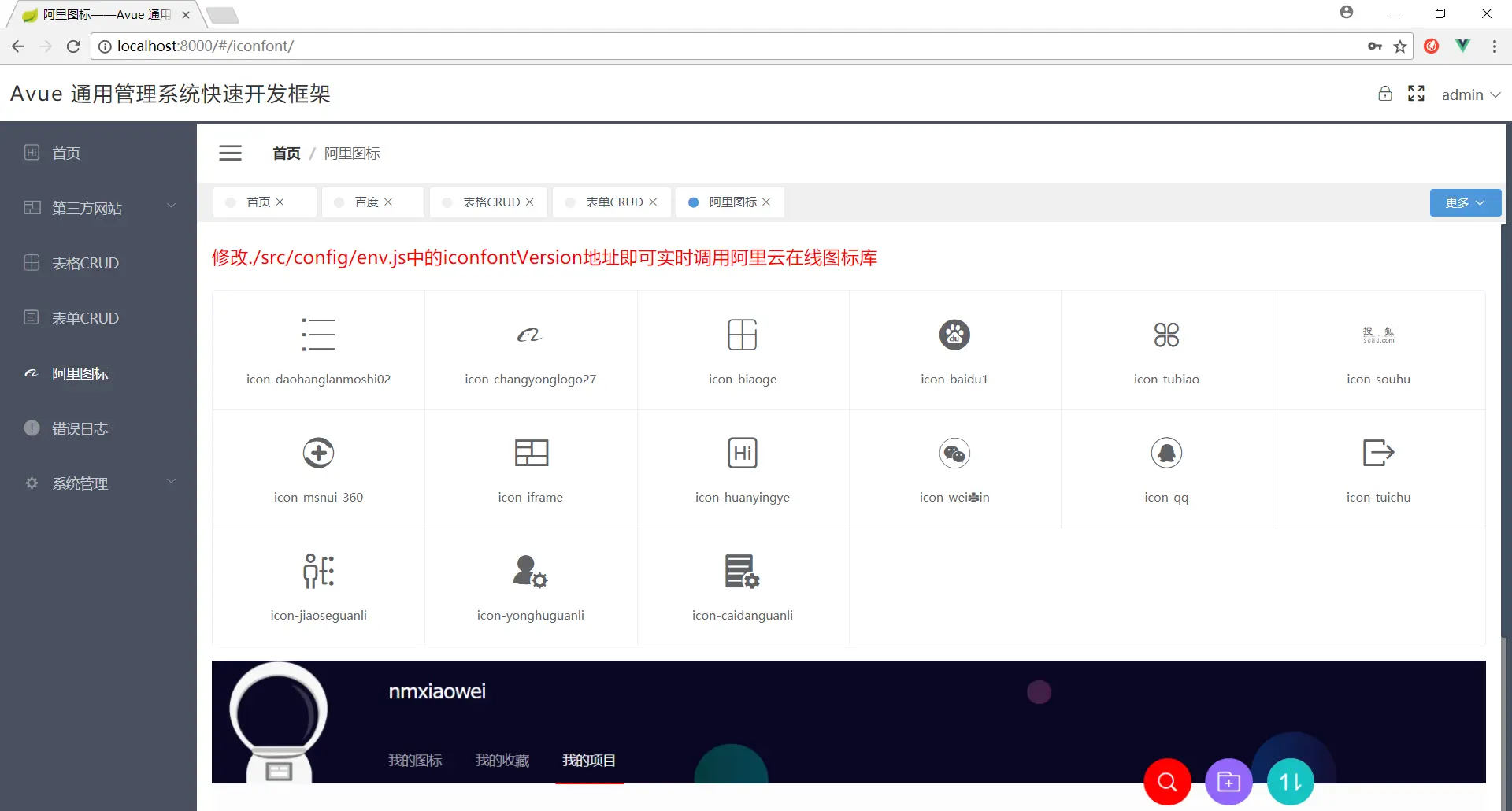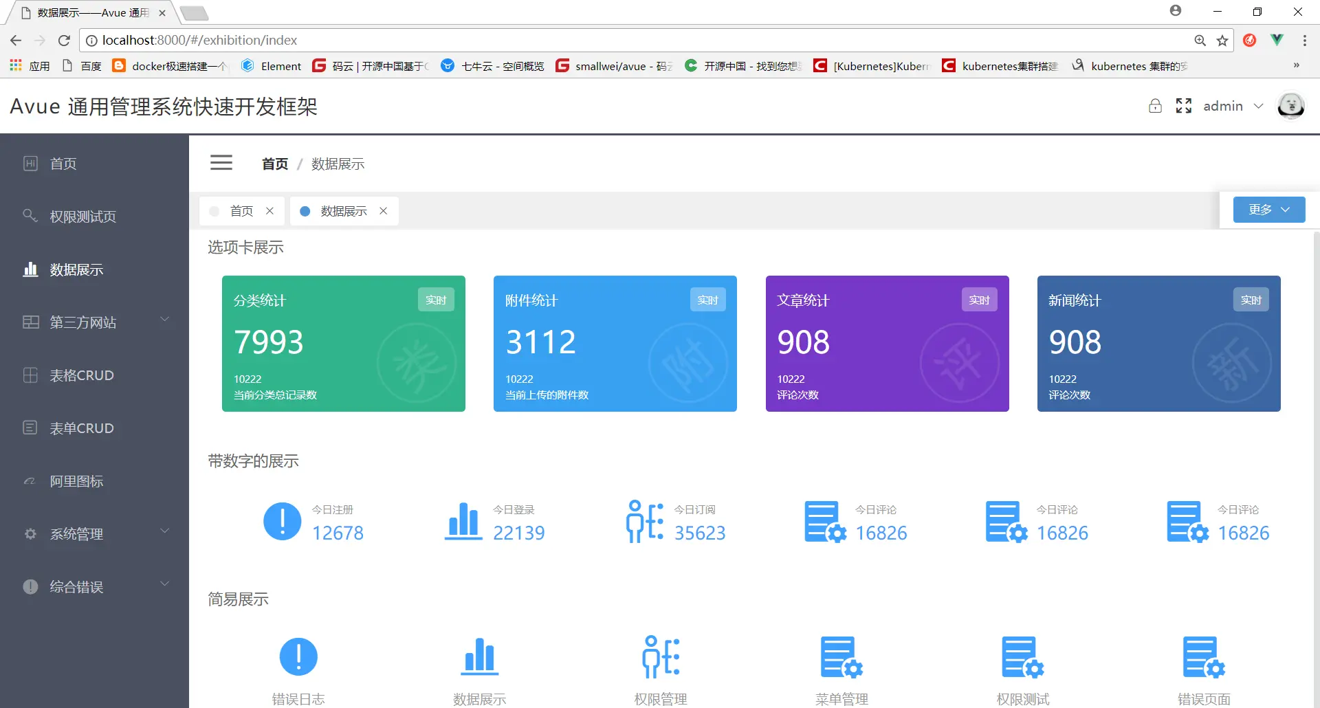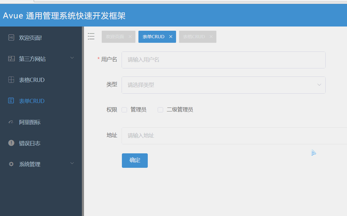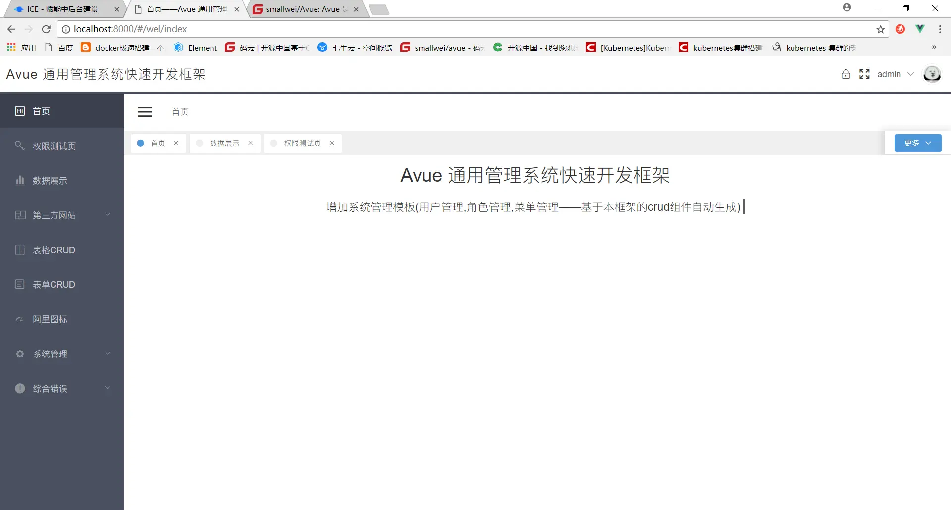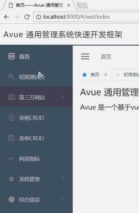 avue 是一个类似easyui那种去写vue的方案支持SSR(服务端渲染)和SPA(单例页面),全部基于json可配置化去开发界面,节约开发成本和提高开发效率,基本构成由 Vue.js 和 element。它使用了最新的前端技术栈,权限验证,第三方网站嵌套等功能,很多功能还在开发,敬请期待