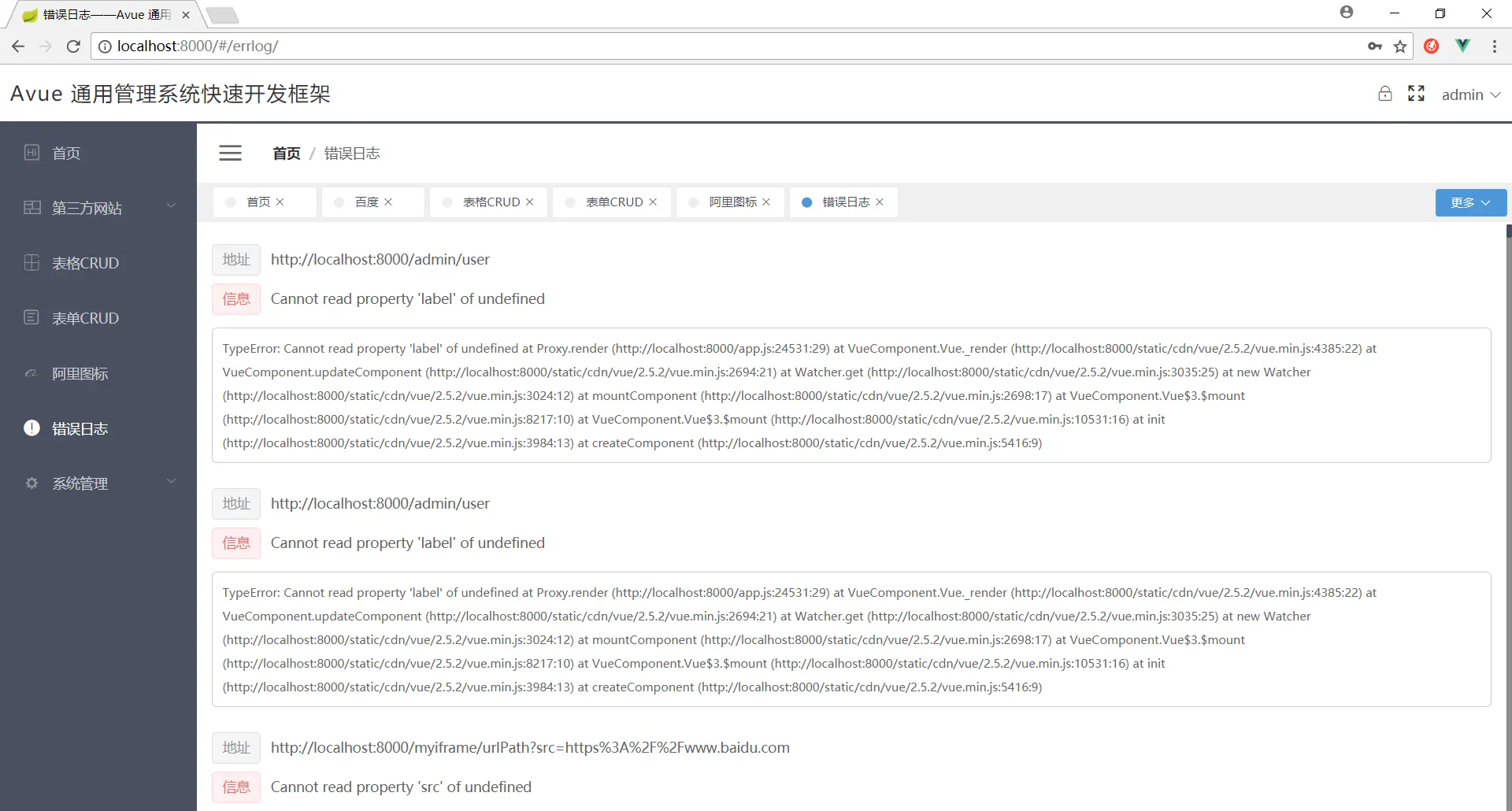 放开./src/page/errlog/index.vue中的errorA的组件即可测试他是存储在本地,可以自己回掉方法上传服务器,调用CLEAR_ALL_ERR方法清空本地