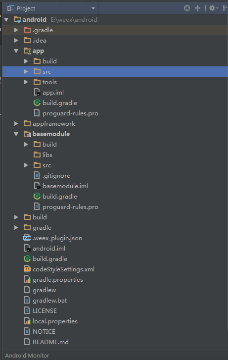 6、注册module,不要到module 里面AndroidManifest.xml指定Application初始化,如果主工程里面也有一个Application,会报错,错误信息不在截图,我的解决方案是module提供一个方法,注册都放在里面,主工程调这个方法