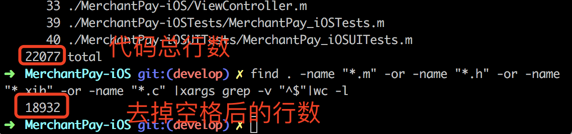 find . -name "*.m" -or -name "*.h" -or -name "*.xib" -or -name "*.c" |xargs grep -v "^$"|wc -l