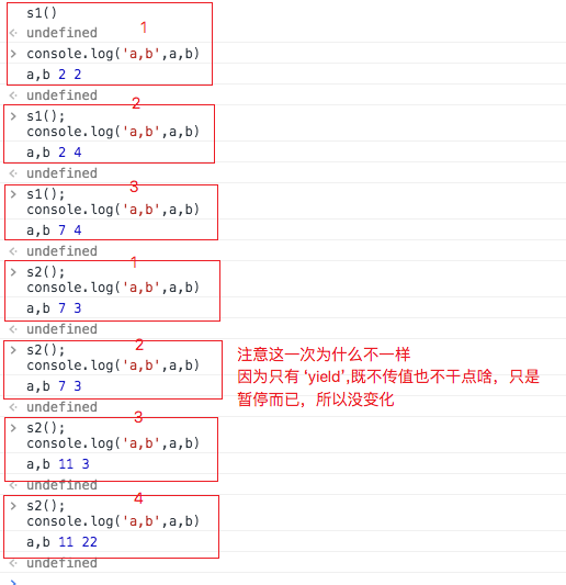 如果想加深一点理解(皮一下),可以随意调换一下s1和s2的执行顺序,总之就是三个s1和四个s2,对于理解多个生成器如何在共享的作用域上并发运行也有指导意义。