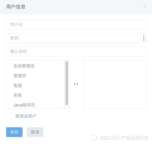 账号:业务系统的用户就是业务人员,每个业务人员分配一个账号,通过给业务人员分配账号验证身份登录业务管理系统进行操作。新增账号时需要设定:用户名、密码和角色,如下: