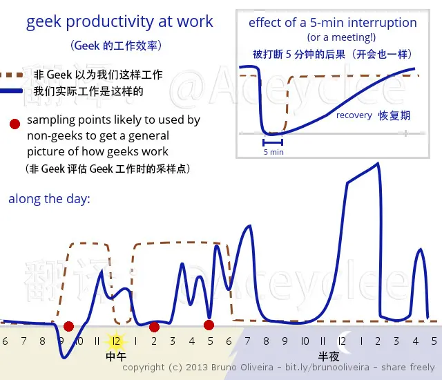 当然啦,对于管理者来说,会议不算什么问题,反正以 Manager's Schedule 安排,下一个小时总要做点什么事情,区别不过是做什么事情罢了。但对于程序员来说,你就总得惦记着。