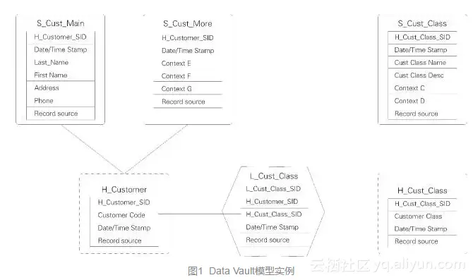 Data Vault模型比ER模型更容易设计和产出,它的ETL加工可实现配置化。通过Dan Linstedt的比喻更能理解Data Vault的核心思想:Hub可以想象成人的骨架,那么Link就是连接骨架的韧带,而Satellite就是骨架上面的血肉。看如下实例(来自Data Vault Modeling Guide,作者Hans Hultgren),如图1所示。