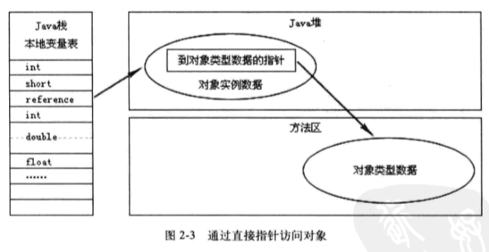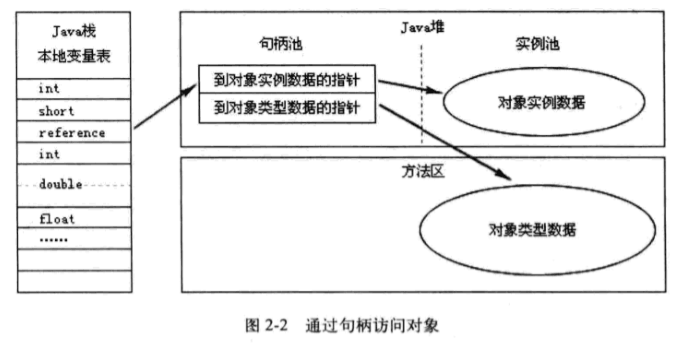 Java堆中划出一块内存来作为句柄池,reference中存储的就是对象的句柄地址,而句柄中包含了对象实例数据和类型数据各自的具体地址信息。