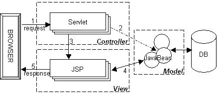 答:Model 1是以页面为中心的Java Web开发,使用JSP+JavaBean技术将页面显示逻辑和业务逻辑处理分开,JSP实现页面显示,JavaBean对象用来保存数据和实现业务逻辑。Model 2是基于MVC(模型-视图-控制器,Model-View-Controller)架构模式的开发模型,实现了模型和视图的彻底分离,利于团队开发和代码复用,如下图所示。