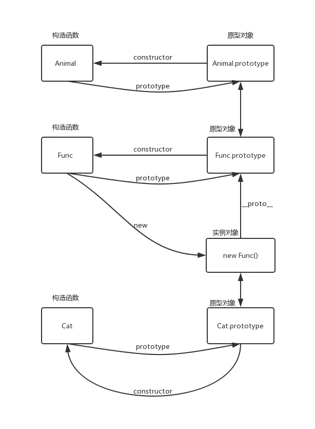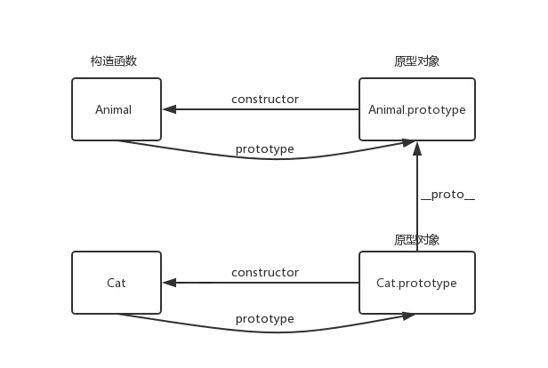 我们知道实例对象中的 __proto__ 属性指向构造函数的 prototype 属性的。这样我们 Animal 的实例对象赋值给 Cat.prototype 。不就也实现了Cat.prototype.__proto__ = Animal.prototype 语句的功能了吗?