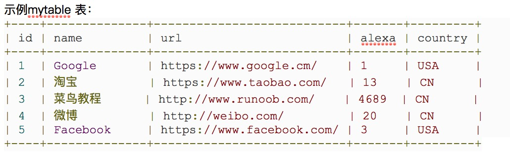 - 示例:INSERT INTO mytable (name,url,alexa,country) VALUES (‘百度’,’https:www.baidu.com’,’4’,’CN’);