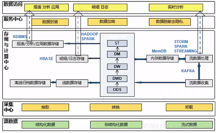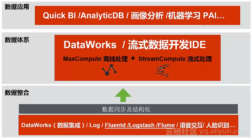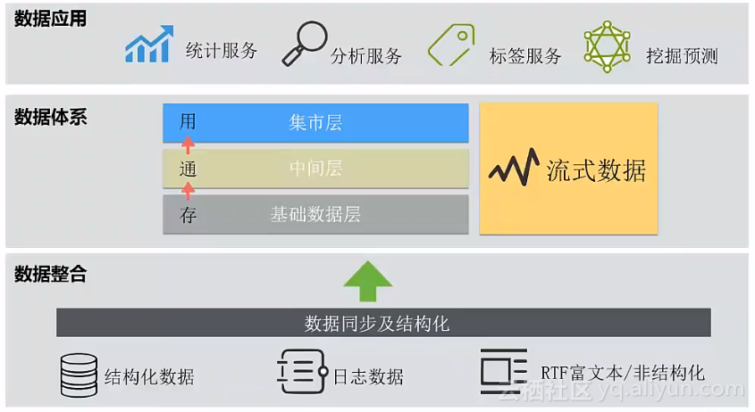 阿里云的数加架构主要分为数据整合、数据体系、数据应用三个层次,如下图: