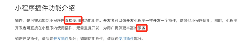 这时再回头看看小程序插件官方介绍,这时候才恍然大悟,原来组件是组件,插件是插件,插件是可以直接提供服务的,组件是给开发者提供的轮子,不能直接提供服务,是两回事。