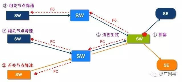 PFC(Priority Flow Control)是一种基于队列的反压协议,拥塞网元根据通过发送Pause帧通知上游网元降速来防止缓冲区溢出丢包,在单机场景下,PFC可以快速、有效的调节服务器速率来保证网络不丢包,但是在多级网络中,就可能出现线头阻塞(如图2)、不公平降速、PFC风暴等问题,而且当有异常服务器向网络中注入PFC报文时,还可能造成整个网络瘫痪。因此,在数据中心开启PFC,需要通过对Pause帧进行严格的监控、管理,以保证网络的可靠性。