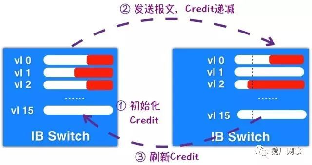 Infiniband是专为高性能计算、存储设计的互联架构,完整定义了一到七层协议栈,具有低时延、无损转发的特点。如图5,IB网络采用基于”credit”的流控机制,发送者在链路初始化时为每个队列协商初始Credit,标明了能向对端发送的报文数,接受者根据自身的转发能力,实时同时发送者刷新每个队列的Credit,当发送者Credit耗尽,则停止发包。由于网元、网卡都必须得到授权才能发包,因此IB网络不会出现长时间拥塞,是能够保证可靠传输的无损网络。IB提供了15个业务队列来区分流量,不同队列的流量不会出现线头阻塞。同时,IB交换机采用”Cut-through”转发模式,单跳转发时延约0.3us,远低于以太网交换机。