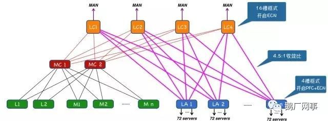 从成本上看,虽然框式交换机单端口成本高于盒式交换机,但是由于单LA的节点已可以满足大部分计算需求,跨LA集群需求有限,减少了互联模块,反而比传统盒式接入、一比一收敛比的方案成本更低。