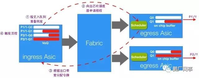 如图6所示,HPC v3.0为两级CLOS架构,汇聚设备LC、接入设备LA均为BCM DUNE芯片的框式交换机,每台LA最多可接入72台40G/100G服务器,考虑到当前大部分应用的集群规模在10~20个节点,并且未来计算节点性能提升、算法的优化也会进一步限制集群规模的增大,因此72台足以满足单个业务的计算需求。DUNE线卡支持4GB的缓存,能够缓存ms级拥塞流量,同时支持基于VoQ的端到端流控方案(图7),能够借助PFC实现同机框下服务器的精确降速。虽然框式交换机的转发时延(4us)会大于盒式交换机(1.3us),但考虑到减少了多级转发、丢包、拥塞带来的时延恶化,并不会影响集群性能。