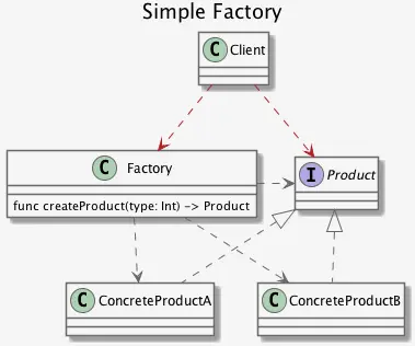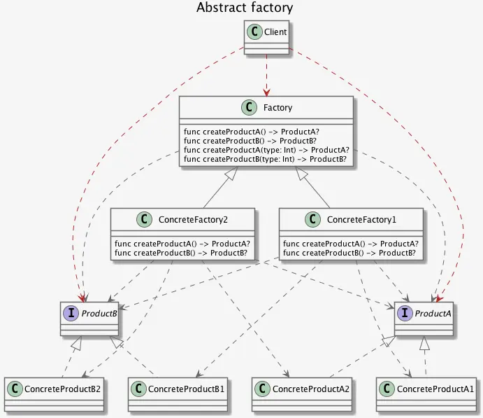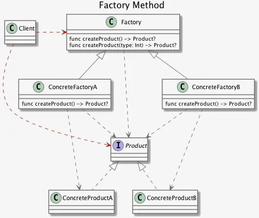 对于工厂方法的实现,有众多不同的解法,比如Factory只保留一个createProduct让子类实现,让Client来选择生成哪个具体工厂实例;或是引入一个FactoryMaker的中间层,作为生产工厂的“简单工厂”。我这里采用的方式是Factory既作为工厂父类,让具体工厂决定生产生么产品,又作为接口类,让Client可以通过依赖注入选择特定工厂。我这样做的目的是,在不引入新的中间层的情况下,最小化Client的依赖。