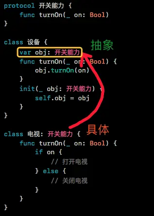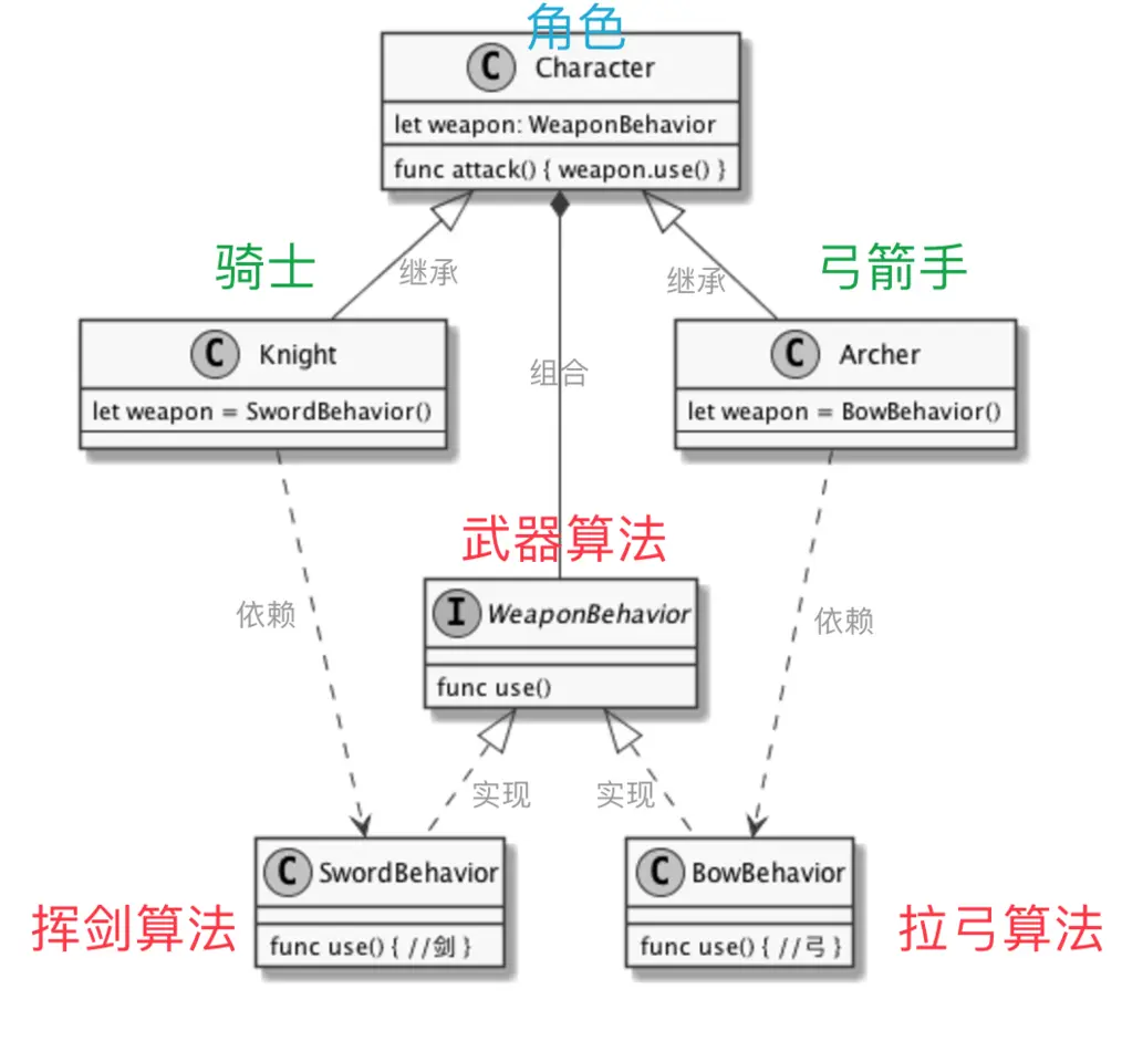 这个模式主要还是在解决一个稳定的继承树当遇到需求变化时的狼狈。他把变化的几种情况分门别类的封装好,然后把自己变化的部分隔离成一个接口实例(interface/protocol),让子类继承后来做选择题。