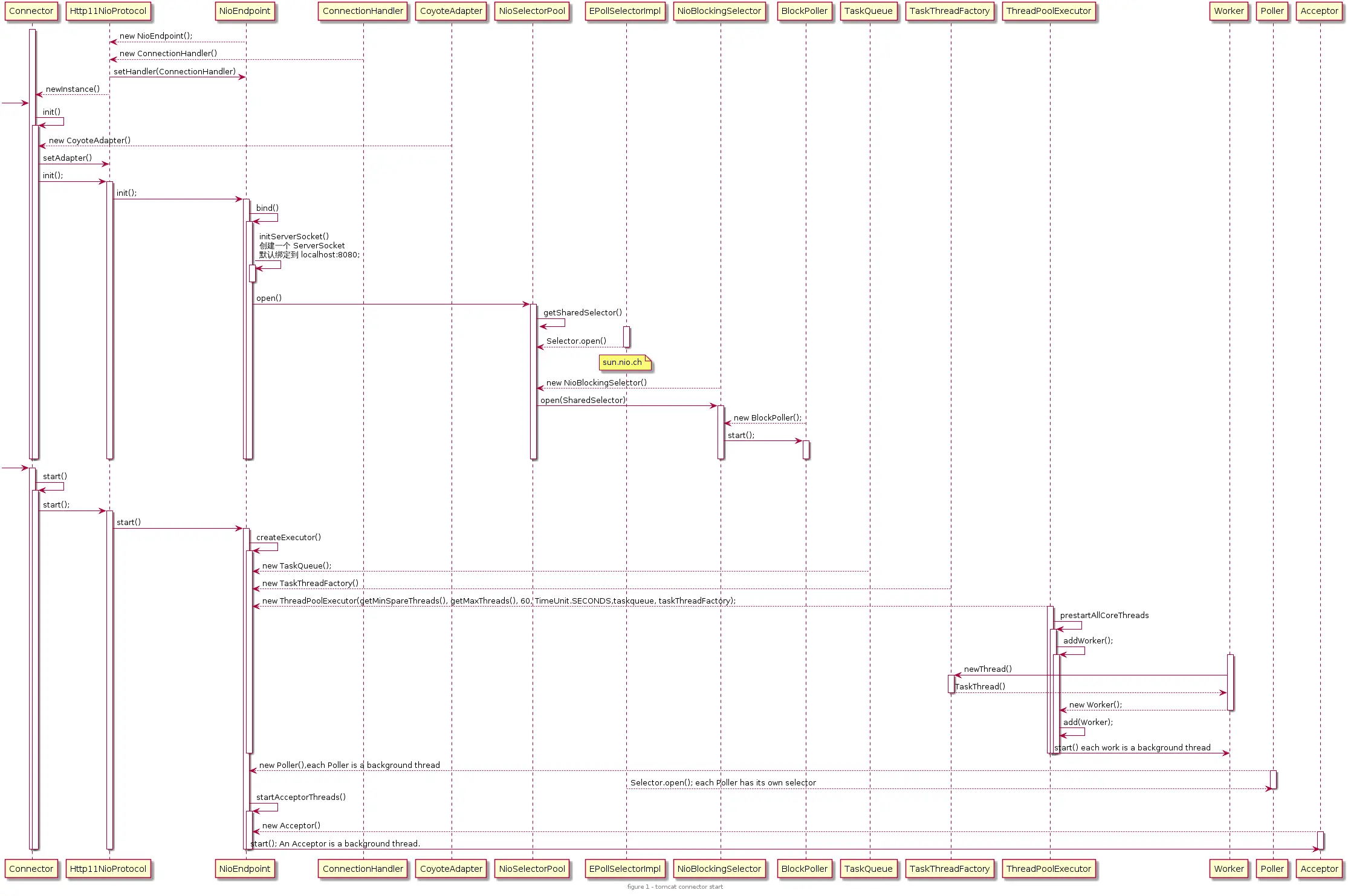 initServerSocket(),通过 ServerSocketChannel.open() 打开一个 ServerSocket,默认绑定到 8080 端口,默认的连接等待队列长度是 100, 当超过 100 个时会拒绝服务。我们可以通过配置 conf/server.xml 中 Connector 的 acceptCount 属性对其进行定制。createExecutor() 用于创建 Worker 线程池。默认会启动 10 个 Worker 线程,Tomcat 处理请求过程中,Woker 最多不超过 200 个。我们可以通过配置 conf/server.xml 中 Connector 的 minSpareThreads 和 maxThreads 对这两个属性进行定制。Pollor 用于检测已就绪的 Socket。 默认最多不超过 2 个,Math.min(2,Runtime.getRuntime().availableProcessors());。我们可以通过配置 pollerThreadCount 来定制。Acceptor 用于接受新连接。默认是 1 个。我们可以通过配置 acceptorThreadCount 对其进行定制。