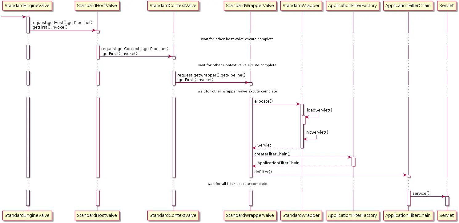 StandardPipeline 上都会有多个已注册的 Valve,我们只关注每个容器的 Basic Valve。其他 Valve 都是在 Basic Valve 前执行。 request.getHost().getPipeline().getFirst().invoke() 先获取对应的 StandardHost,并执行其 pipeline。request.getContext().getPipeline().getFirst().invoke() 先获取对应的 StandardContext,并执行其 pipeline。request.getWrapper().getPipeline().getFirst().invoke() 先获取对应的 StandardWrapper,并执行其 pipeline。- 最值得说的就是