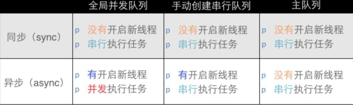 看到这里你不难发现,GCD 提供了同步执行任务的创建方法dispatch_sync和异步执行任务创建方法dispatch_async,配合上述的三种队列形式(串行队列、并发队列、主队列),那么就会存在六种不同的多线程使用方法,如下: