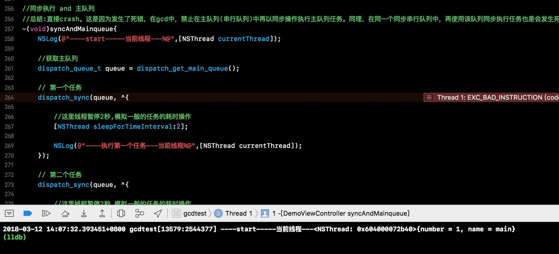 - 同步执行 & 主队列(在主线程中会crash): 主线程中会产生死锁