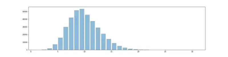 我们将引入一个特殊的字符(11)来表示每个字母的代码之间的空格。例如,SOS 的代码将表示为:...11---*...(替换...---...)。我们这样做是为了确保与给定代码相对应的单词是唯一的。接下来,我们将使用已编译数据集(words_alpha)中的英文单词,而不是用随机生成的字母集作为我们的数据。为了获得数据的感觉,参看下图所示的单词长度的直方图。从直方图上可以看出,长度超过 5 个字母的单词要比短的单词多。