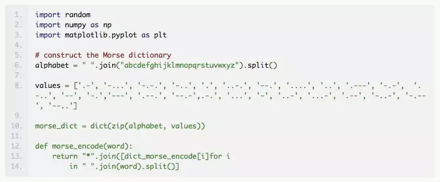 我们开始数据准备工作,构建一个函数,将所输入的英文单词编码为它的 Morse 电码并输出。