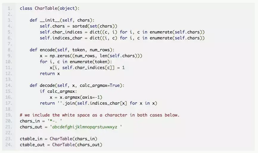 现在,我们构建输入中字符的一个独热编码矢量,使输入数据适合神经网络。为此,我们构建了一个类对象(类似于 Keras 文档中的例子),它将有助于编码和解码,并将 Morse 电码和英语单词解码。我们将类分配给具有适当字符集的对象。