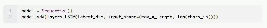 该模型使用 Sequential() 构建,并且每次只添加一个层。第一个 LSTM 层将 3D 张量作为输入,并要求用户指定输入维度。这可以用代码中指定的 input_shape 简单地完成,其中第一个组件表示时间步骤的数量,第二个组件表示特征的数量。对我们来说,特征的数量就是输入序列的词汇表中元素的数量,也就是 4,因为我们有“.”、“-”、“*”和空白字符“”。由于我们每次只提供一个独热编码矢量,因此时间步骤的数量就是 max_len_x。我们还将指定层中的内存单元(或块)的数量(此处用 latent_dim 参数表示,我们使用 256),这是潜在表示的维度。请注意,我们希望将 LSTM 的最终隐藏状态作为潜在表示返回,这包含了来自所有时间步骤的信息,即全部输入序列。如果我们使用 return_sequences = true 选项,那么将得到每个时间步骤的隐藏状态的输出,但这只包含到该步骤的序列信息。