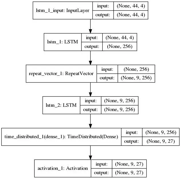 这就得到了简单的编码器模型。我们将构建一个类似的层作为解码器。但上面的代码片段的输出是个 2D 数组。我们通过使用方便的 RepeatVector 层重复输出时间数量 max_len_y,将其转换为 3D 张量,并作为下一个 LSTM 层(解码器)。现在,我们在这个 LSTM 中使用 return_sequences = True 选项来输出隐藏状态序列,我们需要使用这些信息进行预测。为此,我们使用一个 TimeDistibuted 密集层,它输出一个长度为 max_len_y 的矢量,我们使用 softmax 激活函数来选择最有可能的字母。为了快速了解 TimeDistributed 层的目的,请参阅 Jason Brownlee 撰写的博文:How to Use the TimeDistributed Layer for Long Short-Term Memory Networks in Python。