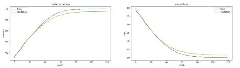 我们将模型拟合到数据中,在集合 x_train、y_train 上进行训练,并使用 x_val 和 y_val 来查看我们的工作情况。需要设置的最后一组参数是轮数(epochs)的数量和批大小。批大小是在梯度下降算法中通过网络传递的训练集的大小,然后对网络中的权重进行更新。通常批大小就是计算机内存可处理的最大值。一个轮数是通过这些批次的训练数据的全面训练一次。此处,我们设置了 1024 的批大小,使用了 120 个轮数,在下图即可看到,在大约 100 个轮数之后,精度并没有明显的增加。一般来说,看哪个参数起作用需要反复试验才知道。现在我们用 fit() 方法来拟合模型。