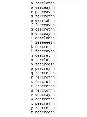 正如你所看到的,错误的预测也不算太坏。我们必须提醒自己,破译密码并没有破解代码,也就是说,弄清楚每个字母代表什么。事实上,我们可以输入字母的代码,并查看网络预测的单个字母的代码,如下所示,我们离目标还很远!