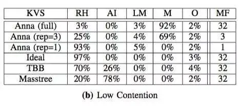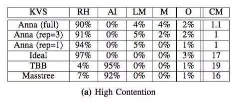 Anna 的性能和伸缩性主要归功于它的完全无协调机制,节点工作进程有 90% 的工作负载是在处理请求,而其他大部分系统(如 Masstree 和英特尔的 TBB)只有不到 10% 的时间在处理请求,它们其余的 90% 时间花在了等待协调上。不仅如此,其他系统因为使用了共享内存,还会出现处理器缓存击穿问题。