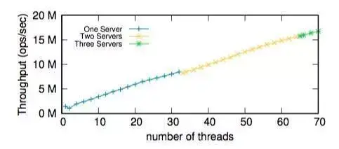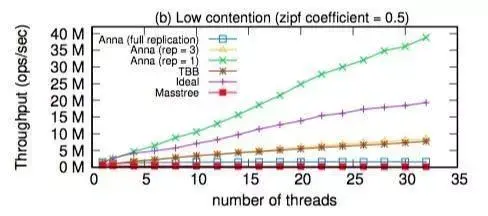 在第一次实验中,他们对比了 Anna 与 TBB、Masstree 和 Ideal 在单台服务器上的吞吐量。他们逐渐增加线程数量,直到达到服务器 CPU 核数的上限,并观察它们的吞吐量。