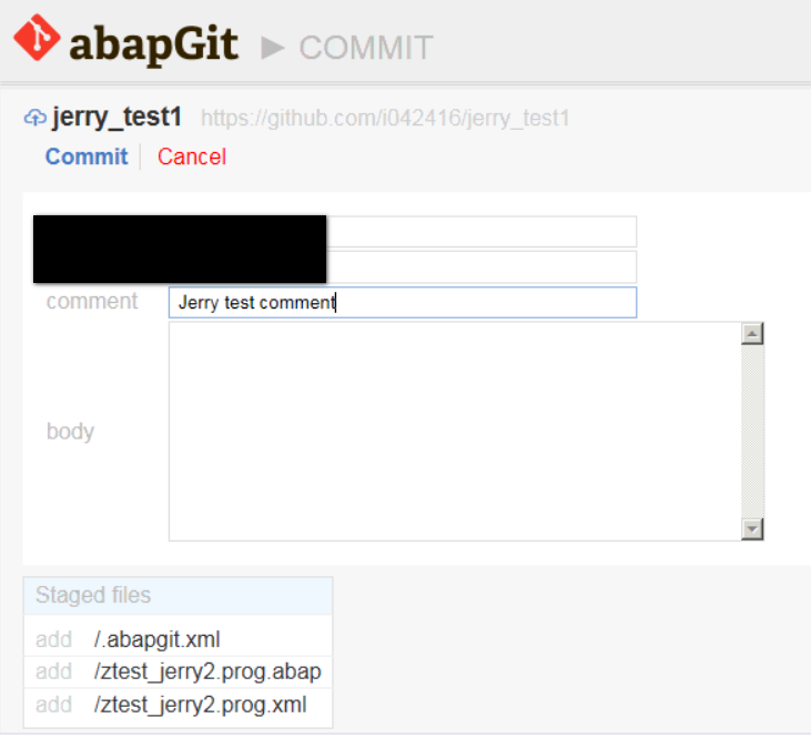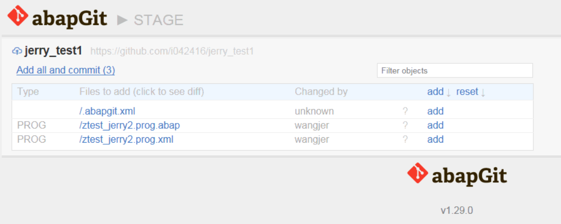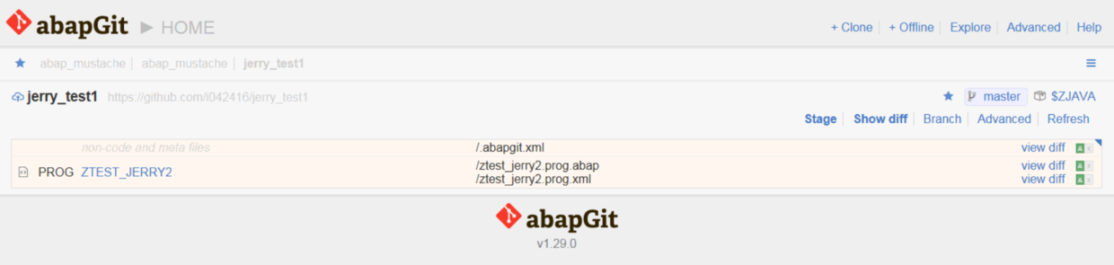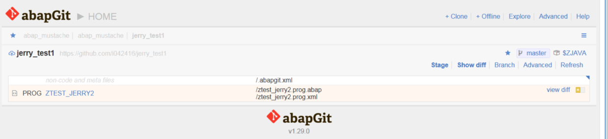 一旦关联完成,一旦ABAP package里有新建代码,这些代码就会出现在git客户端里。例如我创建了一个新的报表ZTEST_JERRY2, 这个改动就会显示在ABAP git客户端里。