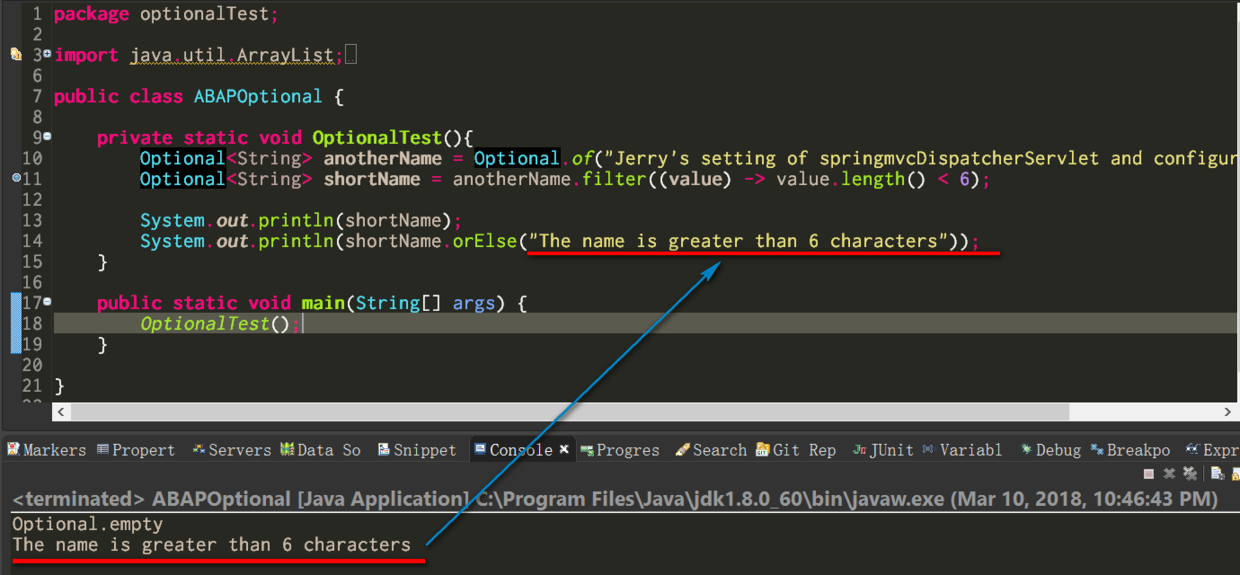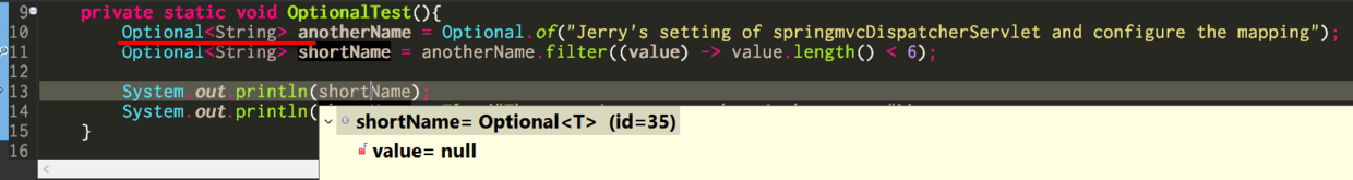 第11行的filter方法,语义上应该返回一个null,因为我在第10行初始化的字符串常量的长度显然大于6. 但是调用这个filter方法的对象是一个Optional对象,所以最终filter方法最终也返回一个Optional对象,这个对象包裹了一个null。如下图调试器里所示: