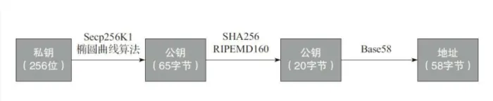 如图所示,比特币系统一般从操作系统底层 的一个密码学安全的随机源中取出一个256位随机数 作为私钥,私钥总数为2 256 个,所以很难通过遍历所 有可能的私钥得出与公钥的对应的私钥。用户使用的 私钥还会通过SHA256和Base58转换成易书写和识别 的50位长度的私钥,公钥则首先由私钥和Secp256k1 椭圆曲线算法生成65字节长度的随机数。一般情况 下,比特币钱包的地址也由公钥所生成,其生成过程 为首先将公钥进行SHA256和RIPEMD160双哈希运 算,并生成20字节长度的摘要结果(即Hash160结 果),这个将作为比特币地址的主体(body)信息, 再在前面加上版本前缀0x00,在后面添加4个字节的 地址校验码。地址校验码通过对摘要结果进行两次 SHA256运算,取哈希值的前4位产生。最后通过 Base58处理把连在一起的版本前缀、主体信息和校验 码转换成可以容易让人识别的比特币字符地址。