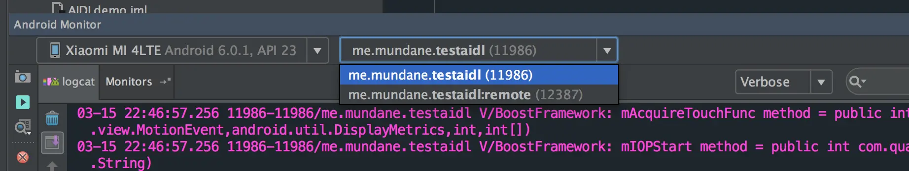 为了实现进程间的通信, 我们需要创建一个独立进程的service, 来模拟进程间的通信, service充当服务端 ":remote"表示在当前的进程名前面附加上当前的包名, 并且是当前应用的私有进程