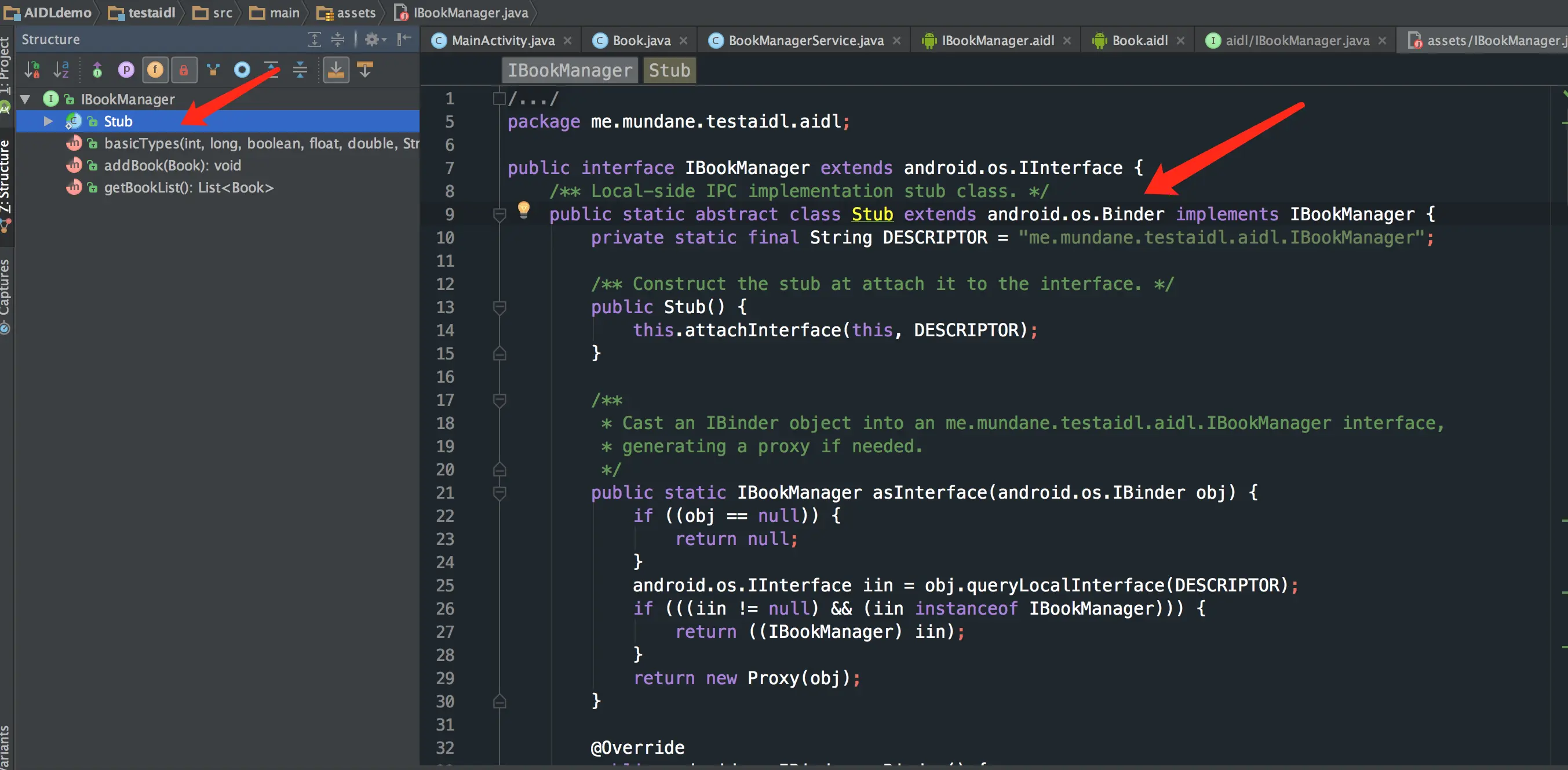 该类中有个重要的内部类Stub, 继承了Binder类, 并实现了IBookManager接口