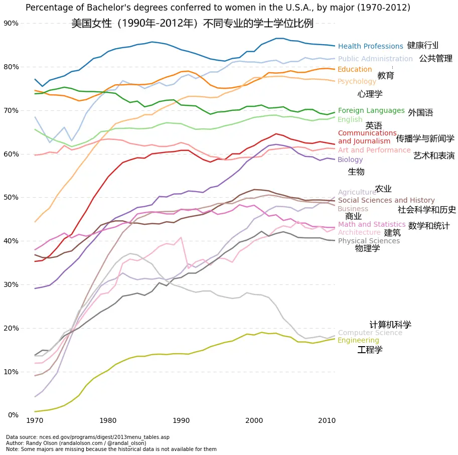 当你可以看到一个变量随着另一个变量明显变化的时候,比如说它们有一个大的协方差,那最好使用折线图。让我们看一下下面这张图。我们可以清晰地看到对于所有的主线随着时间都有大量的变化。使用散点绘制这些将会极其混乱,难以真正明白和看到发生了什么。折线图对于这种情况则非常好,因为它们基本上提供给我们两个变量(百分比和时间)的协方差的快速总结。另外,我们也可以通过彩色编码进行分组。