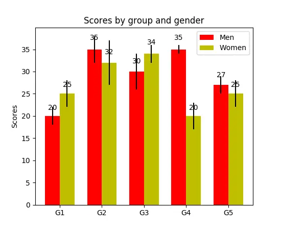 分组的柱状图让我们可以比较多个分类变量。看看下面的图2。我们比较的第一个变量是不同组的分数是如何变化的(组是G1,G2,……等等)。我们也在比较性别本身和颜色代码。看一下代码,y_data_list 变量实际上是一个 y 元素为列表的列表,其中每个子列表代表一个不同的组。然后我们对每个组进行循环,对于每一个组,我们在 x 轴上画出每一个标记;每个组都用彩色进行编码。