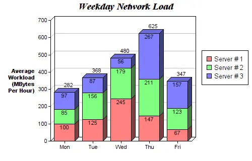 堆叠柱状图可以很好地观察不同变量的分类。在图3的堆叠柱状图中,我们比较了每天的服务器负载。通过颜色编码后的堆栈图,我们可以很容易地看到和理解哪些服务器每天工作最多,以及与其他服务器进行比较负载情况如何。此代码的代码与分组的条形图相同。我们循环遍历每一组,但这次我们把新柱放在旧柱上,而不是放在它们的旁边。