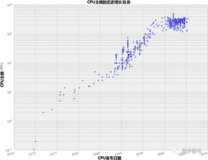图1-1 CPU的时钟速度随时间的变化(数据来自CPU DB)