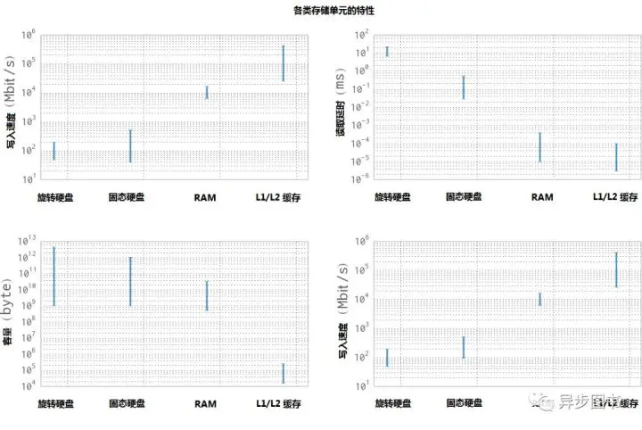 除了读写速度以外,存储单元还有一个延时的属性,表示了设备为了查找到需要的数据所花费的时间。一个旋转硬盘的延时可能较高,因为磁盘必须物理旋转到一定速度且读取磁头必须移动到正确的位置。而从另一方面来说,RAM的延时就比较小,因为一切都是固态的。下面是一个标准工作站内常见的各类存储单元的简短描述,以读写速度排序: