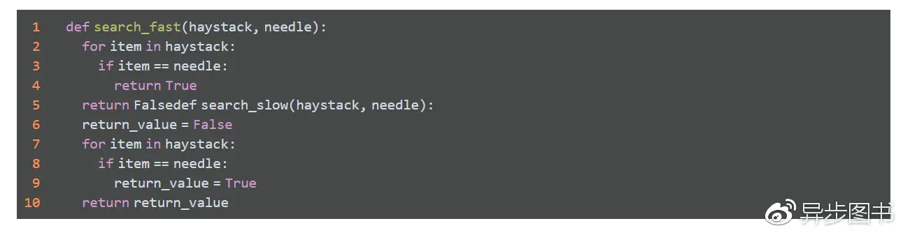 首先我们要意识到Python核心运行于一组非常优化的指令上。而诀窍就是让Python以正确的次序执行它们来获得更好的性能。比如下例,我们可以轻松看出,虽然两个算法都有O(n)的运行时间,search_fast会比search_slow快,因为它提前中止了循环,跳过了不必要的计算。