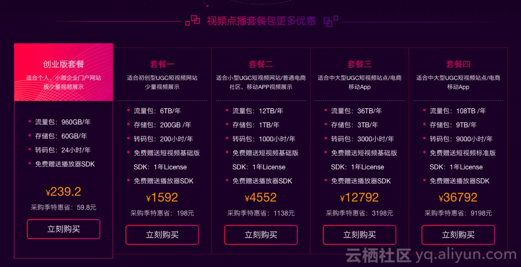 另外,体验完成后,阿里云也为提供了五个点播套餐包,供各种需求用户选择。
