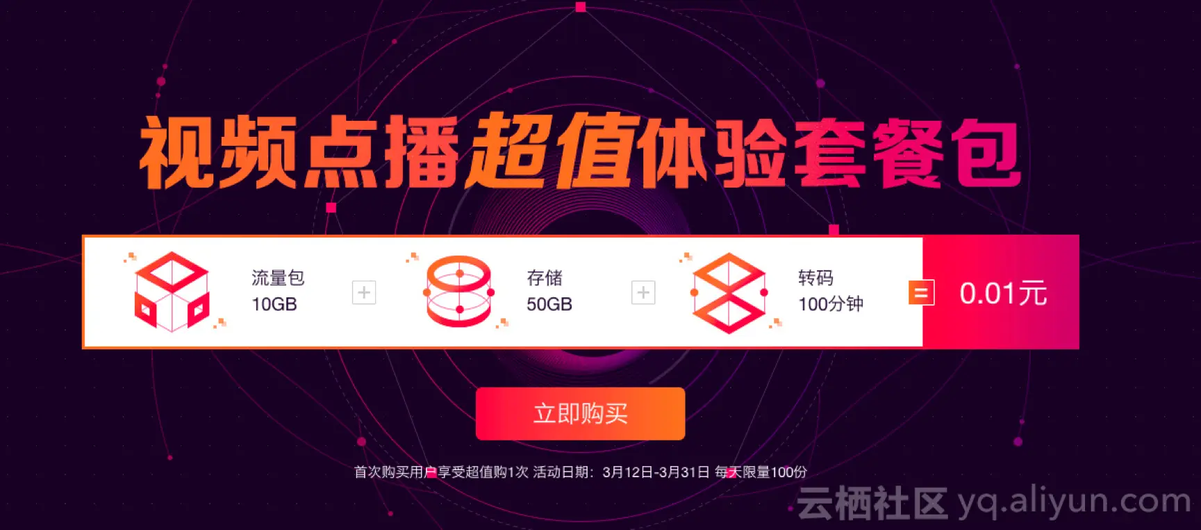 为了扶持更多创业者,降低入行门槛,让更多用户都可以享受到视频技术开放的红利,近日,阿里云放出终极大招,在原有的视频点播服务五个套餐包基础上,推出了超值体验套餐包。只需一分钱即可获得10GB流量、50GB存储、100分钟转码,可供个人、小微企业门户网站体验使用。