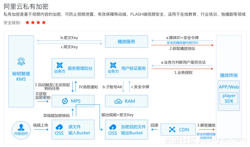 针对此场景,阿里云推出视频加密解决方案,通过其私有加密算法,提升安全级别,即使用户将视频下载到本地,视频本身也是被加密的,无法恶意二次分发。能够便捷、高效、安全地保护视频资源。