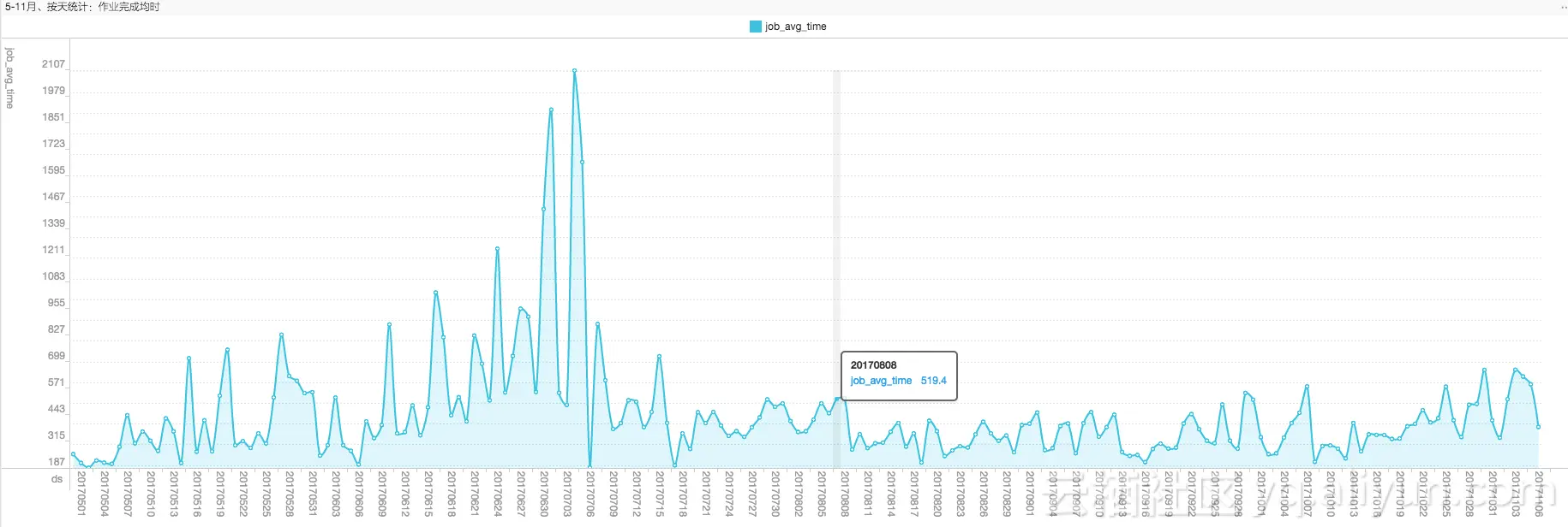 (图1:在MaxCompute2.0上每天大数据作业数量及大数据作业完成时间的提升效果)
