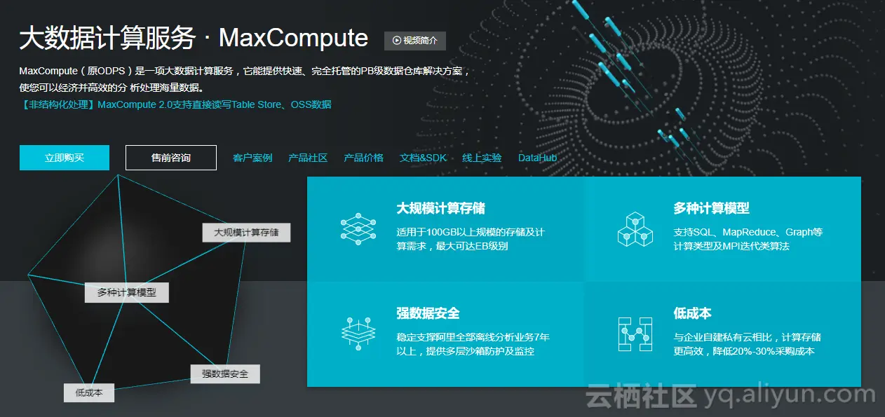 我们采用的是阿里云MaxCompute 大数据计算服务,它能提供快速、完全托管的PB级数据仓库解决方案,使您可以经济并高效的分析处理海量数据。