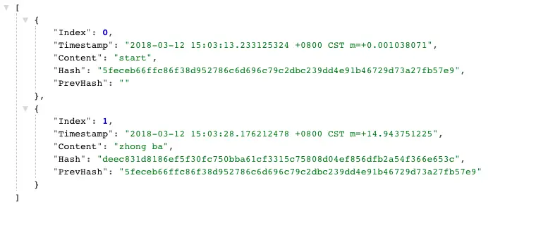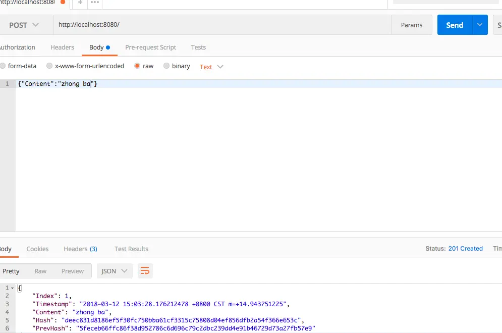 好的,需要的函数都已经列好,下面把它们组装起来即可,然后放到一个main.go的文件中,启动终端,进入到main.go文件夹并输入go run main.go命令。 打开http://localhost:8080/地址,会看到一个创世区块,如果想添加一个新区块则需要使用postman 传一个content参数过去,如图: